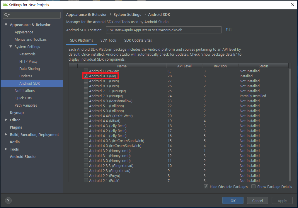 SDK platforms를 보면 Android 9.0(Pie)가 설치됬음을 확인할 수 있다.