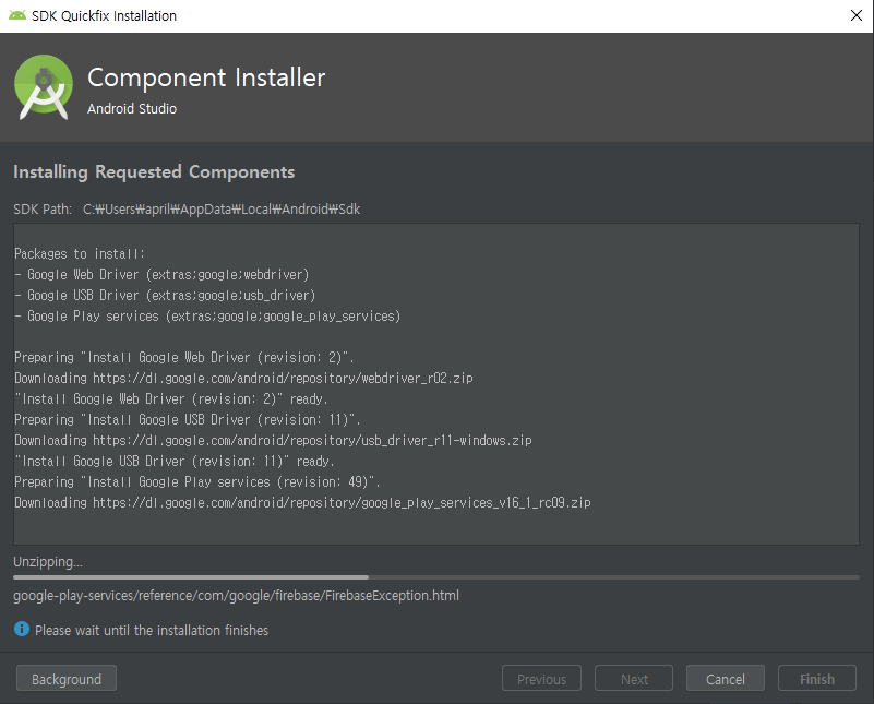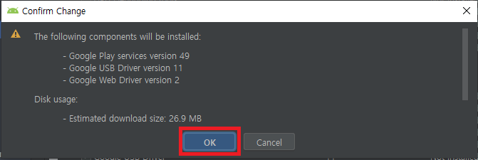 Google play services, Google USB Driver, Google Web Driver, Support Repository를 클릭한 후 OK버튼을 눌러준다.