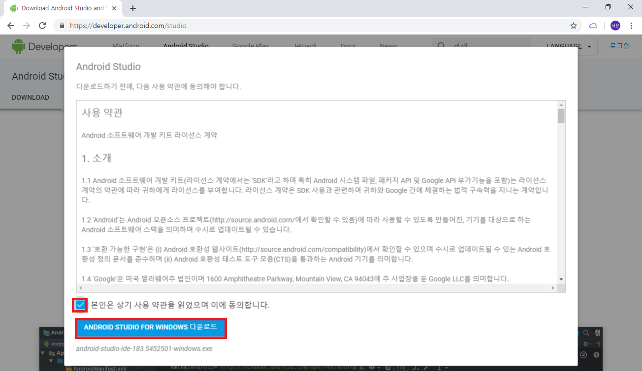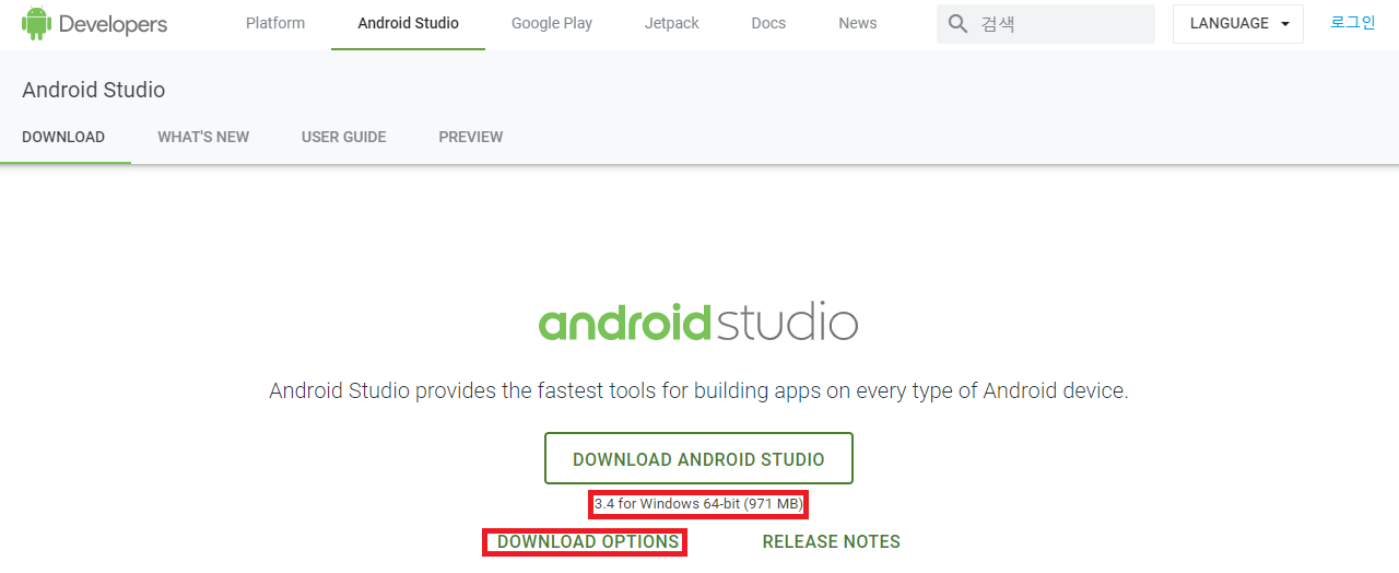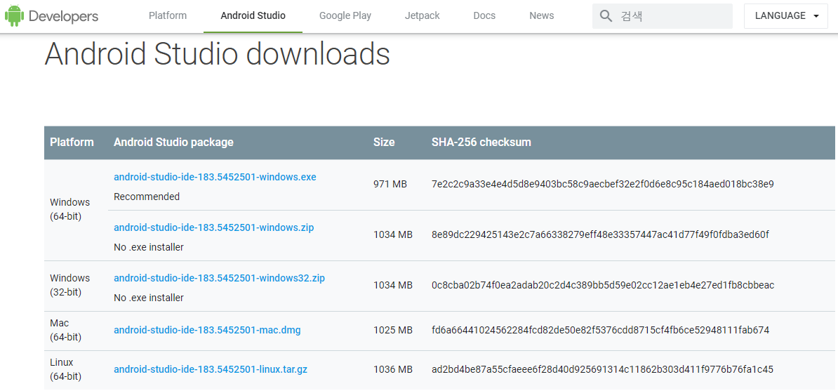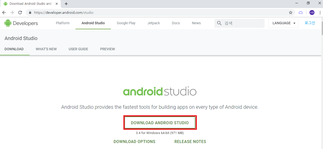 1) https://developer.android.com/studio 에 접속하여 안드로이드 스튜디오 설치파일을 다운받는다.