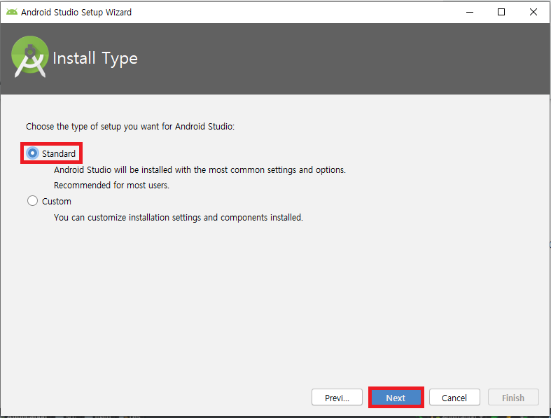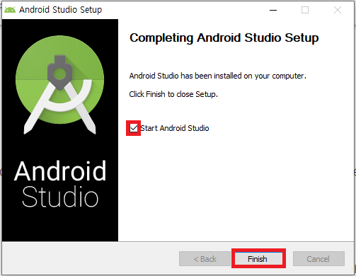 3) Start Android Studio를 클릭하여, 안드로이드 스튜디오를 실행한 후 추가적인 것들을 설치해준다.