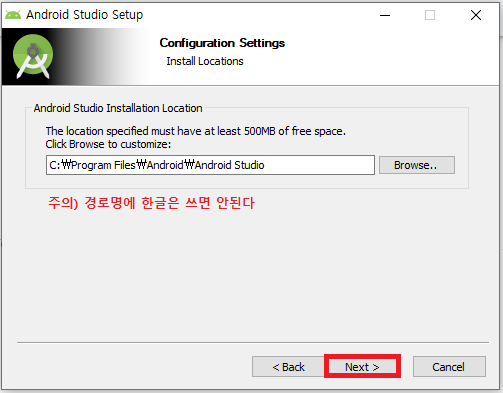 이 때 주의할 점은, 설치할 경로설정 시 한글은 사용하면 안된다.