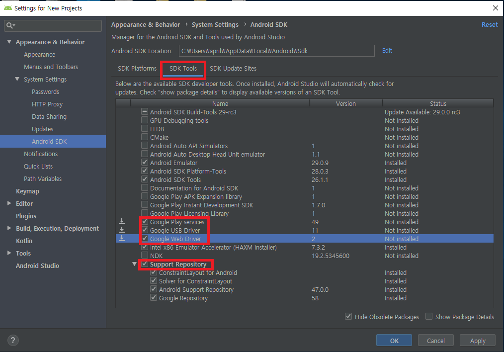 SDK Tools를 클릭하여 필요한 Tool을 추가 설치할 수 있다.