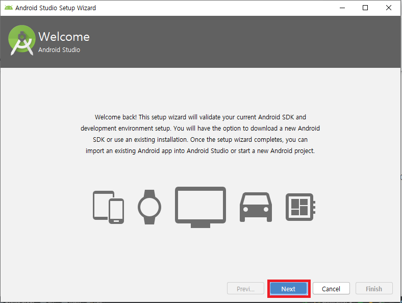 Start Android Studio를 클릭하여 추가적인 것들을 설치해보자.