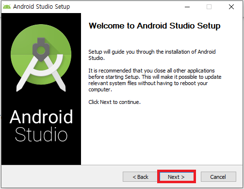 2) 다운받은 파일을 클릭하여 안드로이드 스튜디오 설치를 시작한다.