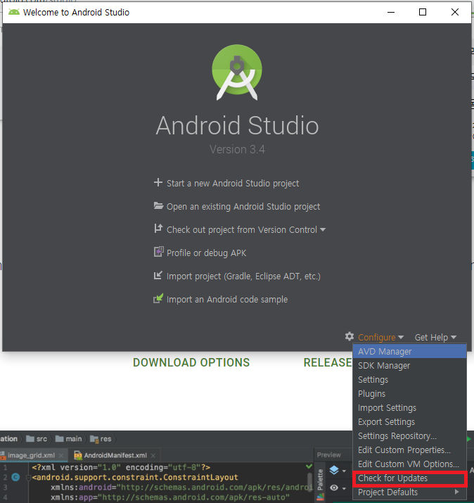 왼쪽 아래 Configure를 클릭하고 Check for Updates를 선택해준다.
